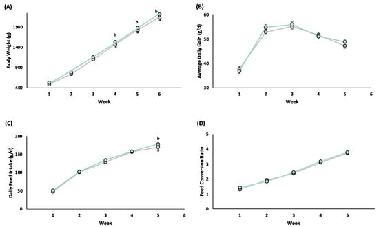 ) on body weight (A), average daily gain (B), daily feed intake (C) and feed conversion ratio (D) in function of the time. Week 1 (28–35 d); week 2 (35–42 d); week 3 (42–49 d); week 4 (49–56 d); week 5 (56–63 d). a,b Means within a row with a different letter were significantly different at p < 0.05. Only performed on healthy animals.