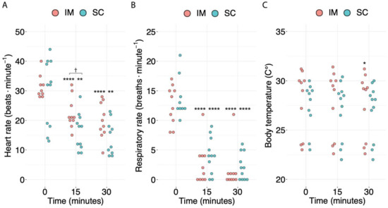 Distribution of the (A) heart rate, (B) respiratory rate, and (C) body temperature over time. For each timepoint, the values for the intramuscular (IM) (n = 10) and subcutaneous (SC) (n = 11) groups are represented in pink (on the left) and light blue (on the right), respectively. Asterisks (*) indicate the order of magnitude of the p-value between the baseline (0 min) and later timepoints within the same treatment. Daggers (†) indicate the order of magnitude of the p-value between different routes of administration at the same timepoint. An absence of symbols indicates a p-value > 0.05. * p < 0.05, ** p < 0.01, **** p < 0.0001, † 0.01 < p < 0.05.