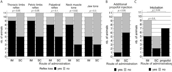 (A) Proportion of animals in the intramuscular (IM) (n = 10) and subcutaneous (SC) (n = 11) groups that lost the thoracic and pelvic limb withdrawal reflexes, palpebral reflex, neck muscle, and jaw tone within 45 min after DMKM administration prior to the decision on additional propofol injection. (B) Proportion of animals in the intramuscular (IM) (n = 10) and subcutaneous (SC) (n = 11) groups that had to be induced with propofol 45 min after the initial DMKM administration. (C) Proportion of animals for which intubation was necessary and successful in the intramuscular (IM) (n = 9) and subcutaneous (SC) (n = 5) groups successfully induced with DMKM after 45 min and the propofol (n = 7) group.