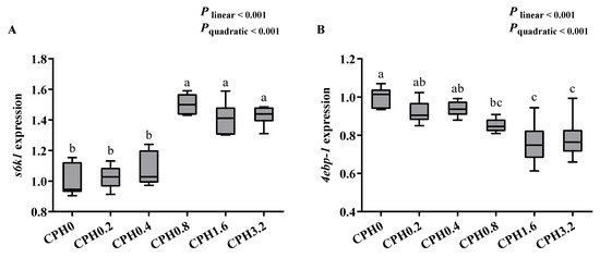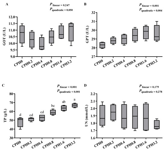 8]. Briefly, cottonseed meal (crude protein content: 54%) purchased from Xinjiang (China) was crushed into a fine powder. Then, a 100-mesh sieve was used to filter the powder. The materials that passed the sieve were thoroughly mixed with a neutral protease (AS1.398, Jiangsu Hipore Feed Co., Taizhou, Jiangsu, China). Then, a 5 h reaction was conducted (40 °C, pH 7.0, protease/substrate ratio 2500 IU/g). The enzymatic reaction was suspended by heating inactivation. After cooling, the solution was poured out, and the supernatant was concentrated with a rotary evaporator (evaporation temperature 65–70 °C), and was poured back and dried at 60 °C. Then, the dry supernatant powder and the dry precipitate were thoroughly mixed, through which the CPH used in this test was obtained. The amino acid profiles of CPH are as follows (g/kg): asparagine 49.39, serine 23.84, glutamic acid 108.98, glycine 22.45, alanine 22.29, cysteine 7.17, proline 19.9, threonine 17.68, valine 23.21, methionine 7.87, isoleucine 16.27, leucine 31.14, phenylalanine 29.73, lysine 22.13, histidine 14.94, and arginine 61.80. Then, graded levels (0, 0.2%, 0.4%, 0.8%, 1.6%, and 3.2%) of CPH were supplemented to the basal diet at the expense of cottonseed meal. The relative molecular mass distribution of the peptides in CPH was detailed previously [