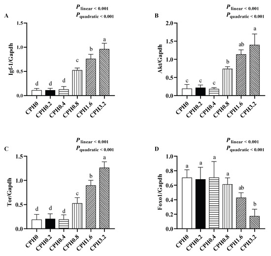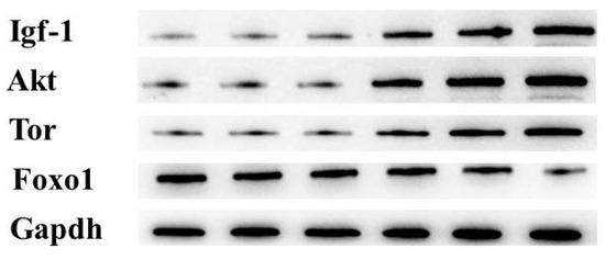 The proteins were transferred to a 0.45 um polyvinylidene fluoride (PVDF) membrane when the power was cut off. When the bromophenol blue moved to the lower border of the separation gel (Millipore, Burlington, MA, USA), the 5% skim milk powder closing solution was used to submerge the PVDF membranes, which were then placed on a shaker and slowly shaken. After 1 h of closure at 25 °C, the primary antibody was applied, the closed PVDF membranes were taken out, and were then incubated at 4 °C overnight. Following that, the membranes and a secondary antibody coupled to horseradish peroxidase were incubated at 25 °C for 2 h. Primary antibodies were insulin-like growth factor-1 (Igf-1, #AB182408, Abcam, Shanghai, China), protein kinase B, (Akt, #AB8805, Abcam, China), target of rapamycin (Tor, #AB134903, Abcam, China), forkhead box O1 (FoxO1, #AB52857, Abcam, China), and glyceraldehyde-3-phosphate dehydrogenase (Gapdh, #60004-1-Ig, Abcam, China). Finally, the bands were treated with the ECL reagent (GoodHere, Hangzhou, China) to visualize the bands. Using the ImageJ program, the intensity of the target bands was measured (U.S. National Institutes of Health, Bethesda, MD, USA).