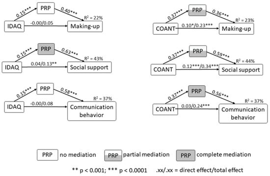 To test direct effects, the three psychological variables were entered in three multiple regression analyses, one for each of the three outcome variables (including age and level of education as covariates). In the model predicting making-up, comparative anthropomorphization and pet role perception both were significant, B = 0.10, p < 0.02, 95% CI 0.02 to 0.19, and B = 0.36, p < 0.001, 95% CI 0.28 to 0.45, respectively. The model explained 22.4% of the variance in making up. In the model with social support as dependent variable, again comparative anthropomorphization and pet role perception both were significant, B = 0.13, p = 0.002, 95% CI 0.05 to 0.22, and B = 0.67, p < 0.001, 95% CI 0.59 to 0.75, respectively. The model explained 43.9% of the variance in social support. In the model with communication behavior as dependent variable, only pet role perception was significant, B = 0.70, p < 0.001, 95% CI 0.60–0.79. The model explained 43.9% of the variance in communication behavior. Thus, pet role perception predicted all three outcome variables, comparative anthropomorphization did not predict communication behavior, while the IDAQ was not related to any outcome variable.