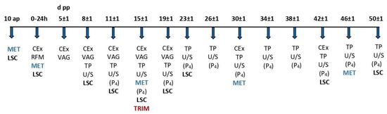Experimental design—schematic representation. d pp = days post-partum, ap = antepartum, ΜΕΤ = blood sampling for metabolic parameters (NEFA and BHBA), LSC = lameness scoring, CEx = clinical examination, RFM = examination for retained fetal membranes, VAG = vaginoscopy, TP = transrectal palpation, U/S = transrectal ultrasonography, (P4) = blood sampling for the detection of progesterone concentration, and TRIM = conservative and therapeutic trimming.