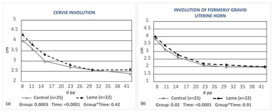 A significant delay in the involution of both the cervix and the formerly gravid uterine horn was found in the lame group compared to the control group (p = 0.0003 and p = 0.02, respectively, Figure 3a,b).