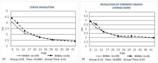 A significant delay in cervix involution (p = 0.05, Figure 4a), but not regarding the formerly gravid horn (p = 0.16, Figure 4b), was observed in cows with BHBA concentrations greater than 1.2 mmol/L compared to cows with optimal BHBA values.