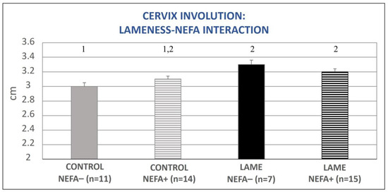 Lameness–NEFA interaction regarding cervix diameter during the entire puerperium period. NEFA incidence was calculated based on different thresholds depending on the day of measurement (at calving: 0.9 mEq/L, on day 15 pp: 0.6 mEq/L, antepartum, and after day 15 pp: 0.4 mEq/L). The results are presented as the least-squares mean (±SE). 1, 2 Different numbers denote statistical differences (p ≤ 0.05).