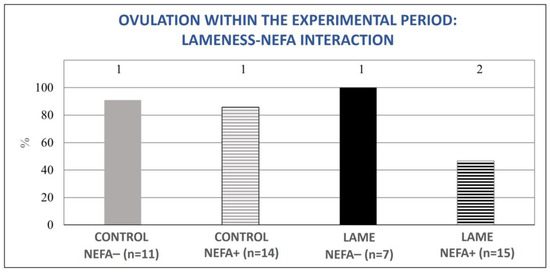 Lameness–NEFA interaction regarding the proportion of cows that ovulated during the experimental period (0–50 d pp). The results are presented as the least-squares mean (±SE). 1, 2 Different numbers denote statistical differences (p ≤ 0.05).