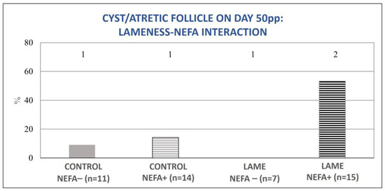 Lameness–NEFA interaction regarding the proportion of cows with an ovarian cyst or atretic follicle on day 50 pp. The results are presented as the least-squares mean (±SE). 1, 2 Different numbers denote significant differences (p ≤ 0.05).