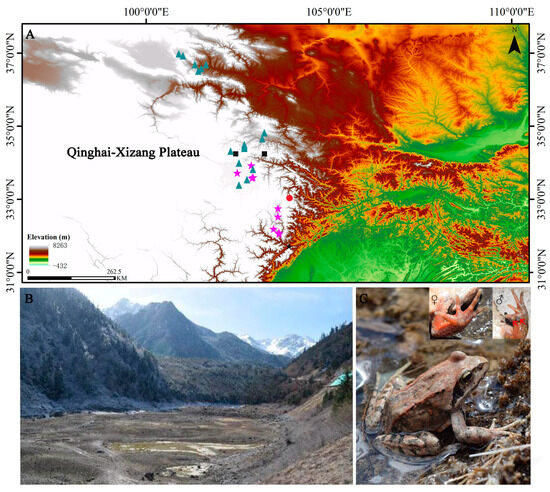 The studying site of Rana kukunoris, newly sampled in this work, is marked by the red circle (A). Other markers are for comparison. Specifically, the other sites were obtained from published literature, including Chen et al. (2011) [42], Feng et al. (2015) [43], and Yu et al. (2021) [44], and are marked by black squares, violet stars, and dark green triangles, respectively (A). Supplementary Materials Table S1 listed the detailed site information including the latitude, longitude, and elevation. The habitat (B) and an adult female photograph (C) of R. kukunoris in the Jiuzhaigou National Nature Reserve. The two red arrows indicate the nuptial pads.