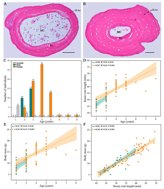 Representative phalangeal growth marks in cross sections of an adult male R. kukunoris at an age of 2 years (A), an adult female at an age of 4 years (B), age distribution (C), relationship between age and snout–vent length (D) and body mass (E), relationship between snout–vent length and body mass (F). Black arrows indicate lines of arrested growth (LAGs), and white arrows indicate the Kastschenko Line (KL). The scale bar is 100 μm. Abbreviations: KL = Kastschenko Line, LAG = line of arrested growth, mc = medullar cavity.