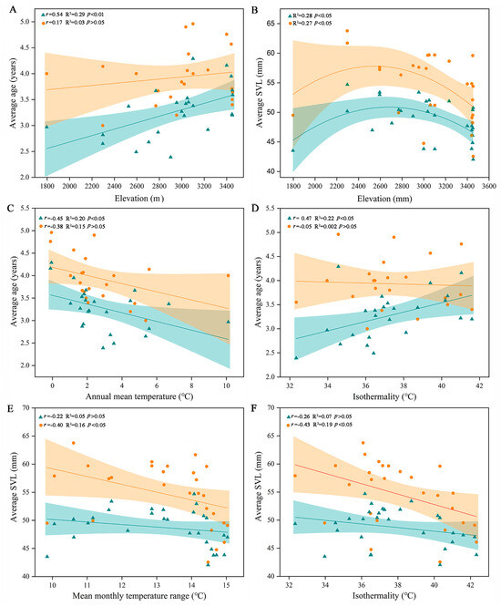 Variation in average age (A) and average SVL (B) of R. kukunoris along an elevational gradient (~1790–3450 m) on the Qinghai–Xizang Plateau, annual mean temperature (C) and isothermality (D) impact on the average age, the mean monthly temperature range (E) and isothermality (F) impact on the average SVL. Green indicates males, and red indicates females.