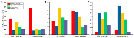 Independent contribution of climatic effects on average age (A), age at sexual maturity (B), and average snout–vent length (C) of male and female R. kukunoris.