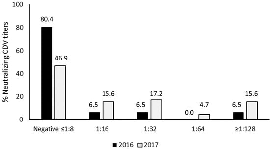 A total of 110 serum samples from GSLs were analyzed. CDV prevalence for 2016 was 19.6% (95% CI: 8.3–30.9%), while for 2017, it was 53.1% (95% CI: 41.2–65.1%). A significative increase in the frequency of neutralizing antibodies to CDV was observed in the 2017 samples compared to the 2016 samples (p = 0.04), even with much higher serum neutralizing titers (≥1:128), as can be seen in Figure 1. Also, the proportion of negative GSL serum samples was significantly lower in 2017 in comparison to 2016 (p < 0.01), indicating an increasing CDV exposure between 2016 and 2017.