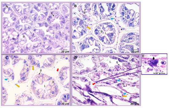 Histology of shrimp hepatopancreas under EHP infection. (A) Hepatopancreas of the control shrimp; hepatopancreas of EHP-challenged shrimp at 5th dpc (B), 10th dpc (C) and 20th dpc (D). The blue arrow indicates scattered cells, the yellow arrow indicates vacuoles between hepatic tubules, the red arrow indicates broken basement membrane and the black arrow indicates EHP spores (E). B, B cells; L, lumen; R, R cells.
