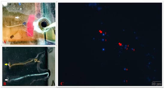 White feces of EHP-infected shrimp and fluorescence microscopic observation of EHP spores in the white feces. (A) White feces floating in the aquaculture tank (white arrow); (B) the yellow arrow indicates healthy feces, and the white arrow indicates white feces; (C) the red arrow indicates EHP spores in white feces.