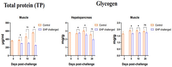 Total protein content in the muscle and glycogen content in the hepatopancreas and muscle of shrimp after EHP infection (mean ± SE, n = 6). The superscript symbol * depicts the statistical significance at p < 0.05. ns: not significant.