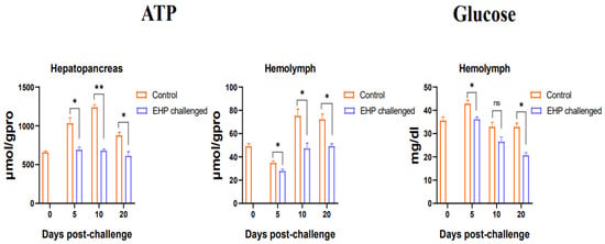 ATP content in the hepatopancreas and hemolymph, and glucose content in the hemolymph of shrimp after EHP infection (mean ± SE, n = 6). The superscript symbol * depicts the statistical significance at p < 0.05, and ** depicts the statistical significance at p < 0.01. ns: not significant.