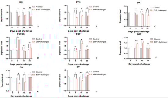 Relative expression levels of glucose metabolism-related genes in the hepatopancreas of P. vannamei after EHP infection (mean ± SE, n = 6). Glycolysis-related genes: HK, PFK, PK (A–C); Gluconeogenesis-related genes: PEPCK, FBP, G6P (D–F); TCA cycle-related genes: CS, IDH (G,H). The superscript symbol * depicts the statistical significance at p < 0.05, and ** depicts the statistical significance at p < 0.01. ns: not significant.