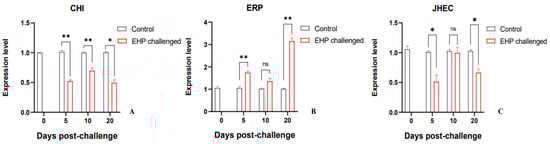 Relative expression levels of growth-related genes CHI (A), ERP (B) and JHEC (C) in the hepatopancreas of P. vannamei after EHP infection (mean ± SE, n = 6). The superscript symbol * depicts the statistical significance at p < 0.05, and ** depicts the statistical significance at p < 0.01. ns: not significant.