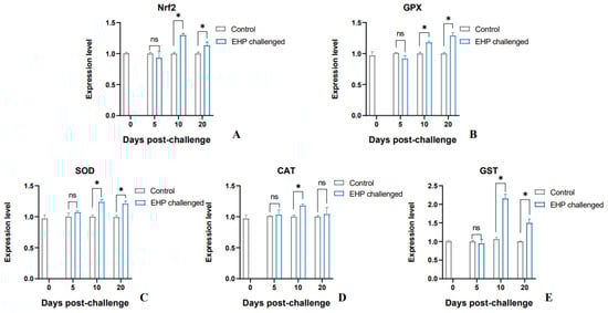 Relative expression levels of antioxidant genes Nrf2 (A), GPX (B), SOD (C), CAT (D)and GST (E) in the hepatopancreas of P. vannamei after EHP infection (mean ± SE, n = 6). The superscript symbol * depicts the statistical significance at p < 0.05. ns: not significant.