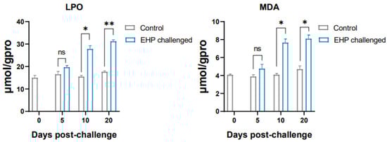 LPO and MDA content in the hepatopancreas of shrimp after EHP infection (mean ± SE, n = 6). The superscript symbol * depicts the statistical significance at p < 0.05, and ** depicts the statistical significance at p < 0.01. ns: not significant.