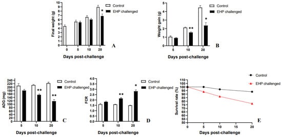 The growth performance of the control group and the EHP challenge group. It mainly includes final weight (A), weight gain (B), ADG (C), FCR (D) and survival rate (E). The superscript symbol * depicts the statistical significance at p < 0.05, and ** depicts the statistical significance at p < 0.01.