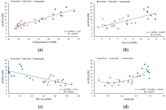 Regression analyses were used to search for various factors influencing BC/g DM and the use of HCl/g of DM. In our study, the content of CP was the most important factor that influenced the buffering capacity of dog food. In the multiple regression, CP had a very strong and positive significant influence on the BC/g of DM and used HCl/g of DM, both with a