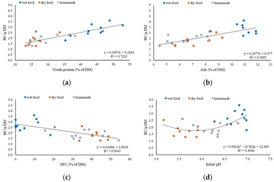 Dry food had a mean DM content of 90.6%, which was a higher DM content than wet food (22.7%) and homemade food (26.4%). Also, the BC of dry food (8.22) was higher than the BC of wet food (3.02) and homemade food (2.40). These values could be explained through the measurement and calculation method of the BC. For the BC analysis, samples of 5 g from each food were used and the DM content of each food was not considered. However, if the BC was corrected for the DM, the DM content was considered, wet food had a mean of 2.72, a significantly higher BC/g of DM than dry food (1.83) and homemade food (1.86). This aspect shows why it is so important to compare the different feeds on a dry-matter basis; otherwise, the results would be misinterpreted. However, the multiple regression proved a negative significant influence (p < 0.05) of the DM content of the tested food on the BC/g of DM. This means that, the more water the food contains per gram of DM, the higher the BC/g of DM.
