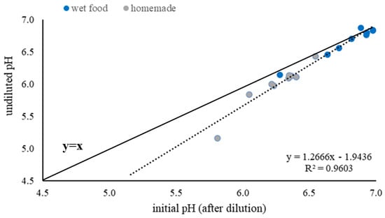 In our study, we could observe differences in initial pH, BC/g of DM, and used HCl/g of DM among the different food types. The lowest initial pH was dry food with a mean pH of 5.62, followed by homemade food, with a mean pH of 6.31. The highest pH was wet food, with a mean pH of 6.77. A possible explanation for the high initial pH in wet food could be the significantly higher CP content in wet compared to dry food. A study identified that feedstuffs with a high protein content have an initial pH around neutrality [