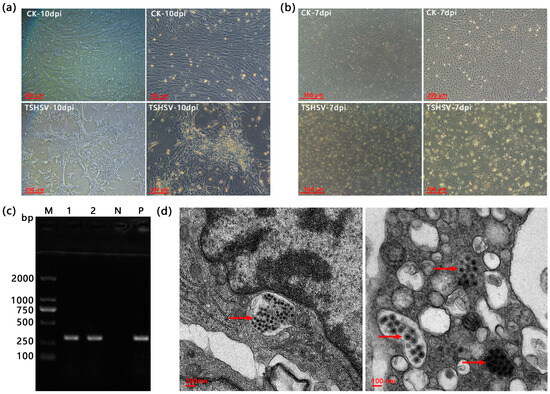(a) The cytopathic effects of TSK infected at ten dpi. (b) The cytopathic effects of TSSP at seven dpi. (c) The PCR detection results of TSHSV in TSK and TSSP. M: DL2000 Marker, 1: TSK, 2: TSSP, N: negative control (dd H2O), P: positive control. (d) The transmission electron microscopy (TEM) of splenic cells for virus localization. The red arrows point to TSHSV virions. Note: (a,b) CK is the normal cells, and TSHSV is the infected cells.