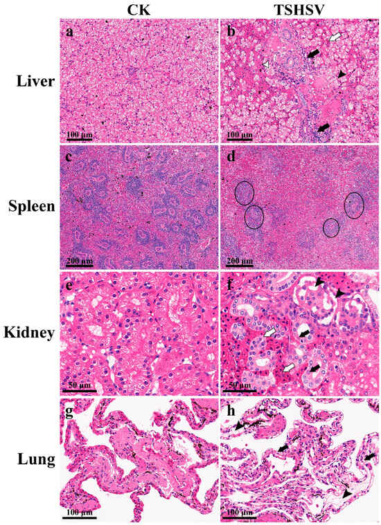 The TSHSV-infected liver was characterized by swollen cells with vacuolated cytoplasms and condensed nuclei. Confluent lytic necrosis was observed in hepatocytes, which formed a bridging necrosis. Apparent blood stasis was observed in the hepatic sinuses and interlobular arteries. The extensive inflammatory cell infiltration accumulated around the bile duct (Figure 2b). In TSHSV-infected spleen, lymph nodules exhibited severe atrophy, necrosis, and disintegration; lymphocytes were scattered and sparse (Figure 2d). In TSHSV-infected renal tissue, necrotic areas in the renal parenchyma were characterized by distinct hemorrhages. The renal cells exhibited nuclear pyknosis and karyolysis. The renal tubules atrophied and the renal sacs dilated, leading to an enlarged space. Some cells in the glomeruli disintegrated, forming a cavity (Figure 2f). Compared to the normal lung, the TSHSV-infected lung demonstrated apparent structural disorders. The alveolar cells were characterized by nucleolysis and cytoplasmic vacuolation. The elastic fibers in the alveolar walls disintegrated (Figure 2h).