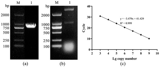(a) The PCR amplification product, M: DL2000 DNA Marker, 1: PCR product, (b) the enzyme digestion identification, M: DL2000 DNA Marker, 1: double enzyme digestion, (c) the standard curve.