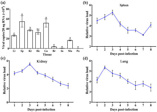 (a) The distribution of TSHSV in tissues of naturally diseased turtles. Data are presented as mean ± SD from three biological replicates. The horizontal axis from left to right represents the liver, spleen, kidney, heart, lung, brain, intestine, muscle, and parotid gland. Columns with different letters indicate significant differences (p < 0.05), while the same letters indicate no significant difference (p > 0.05). (b–d) The trend of viral replication in the spleen, kidney, and lungs in artificially infected turtles. Results are shown as mean ± SD of three biological replicates.
