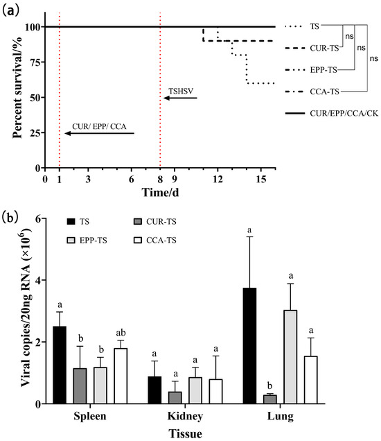 (a) The survival curves of T. sinensis under three different drugs. (b) The inhibitory effect of three different drugs on viral load. For the same tissue, columns with different letters indicate significant differences (p < 0.05), while the same letters indicate no significant difference (p > 0.05). ns: no significance.