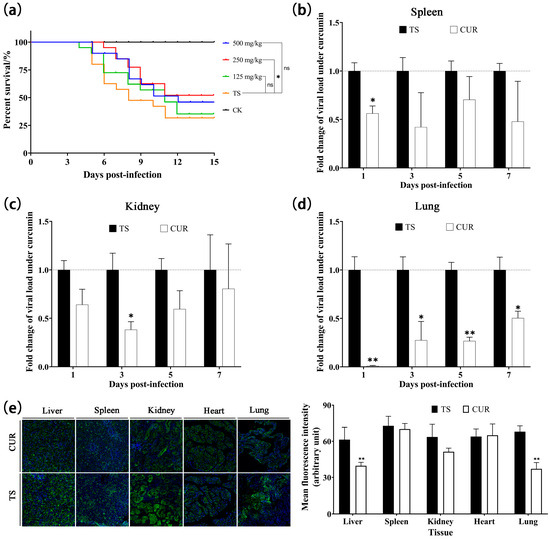 (a) Kaplan–Meier survival curves under different concentrations of curcumin. (b–d) The inhibitory effect of curcumin on viral load in spleen, kidney, and lungs, respectively. (e) The inhibitory effect of curcumin on viral protein expression. (* p < 0.05, ** p < 0.01, ns: no significance).