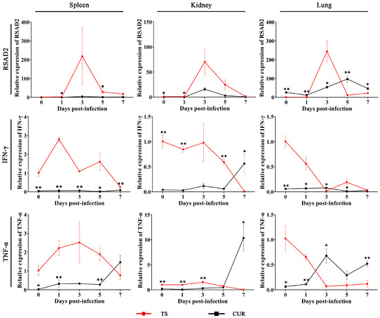 The expression of immune-related genes was assayed. The RSAD2 mRNA expression in the TS group tended to initially increase and subsequently decrease, reaching its highest level at three dpi. Curcumin significantly reduced RSAD2 mRNA expression in the spleens and kidneys (p < 0.05), but significantly enhanced RSAD2 expression in the lungs (p < 0.05). IFN-γ mRNA expression in the TS group generally showed a declining trend over time. Except for the kidneys and lungs at three and seven dpi, curcumin significantly reduced IFN-γ mRNA expression (p < 0.05). Curcumin reduced TNF-α mRNA levels in the spleens (0, 1, and 5 dpi), kidneys (0–3 dpi), and lungs (0 and 1 dpi) (p < 0.05). However, with the exacerbation of TSHSV infection, the TNF-α mRNA level showed an increasing trend in the CUR group, and was even significantly higher than the TS group in the kidney and lung at seven dpi (p < 0.05) (Figure 7).