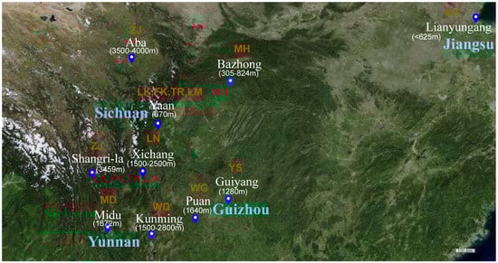 Sample collection site of native chickens. ZJ: Tibetan Chicken, MH: Mountainous Meihua Chicken, XH: Xuhai Chicken, MD: Midu Chicken, WD: Wuding Chicken, LN: Luning Chicken, WG: Black-bone Chicken, YS: Yaoshan Chicken, LK: Tianfu green shell layer, FK: Tianfu powder shell laying chicken, LM: Roman pink shell layer, TR: Tianfu broiler.