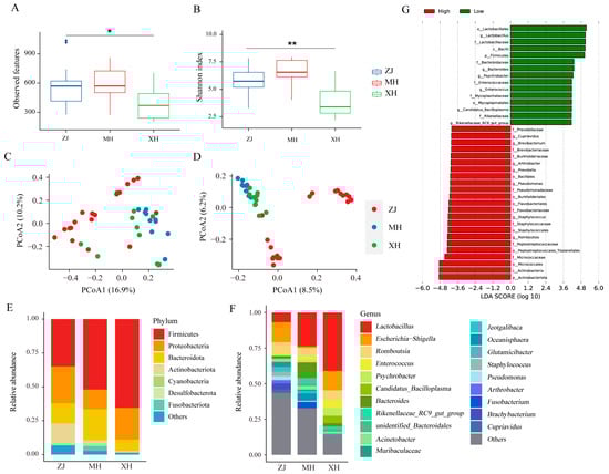 To assess the alpha diversity of gut microbes at high and low altitudes, we calculated the observed features and Shannon index. The results indicated no significant difference between ZJ and MH, while the α-diversity of ZJ was significantly higher than that of XH (Figure 2A,B). Furthermore, principal coordinate analysis (PCoA) based on Bray–Curtis and Jaccard distances was employed to evaluate β-diversity. As depicted in Figure 2C,D, ZJ exhibited distinct separation from MH and XH, whereas MH and XH, representing chickens from low altitude, clustered together, implying a substantial dissimilarity in microbial composition between chickens at high and low altitudes. Further examination of the microbial composition at the phylum level (Figure 2E) revealed that Firmicutes, Proteobacteria, Bacteroidota, and Actinobacteriota were the predominant groups with higher abundances across all three groups. However, Firmicutes exhibited a higher abundance in the low-altitude group. At the genus level (Figure 2F), Lactobacillus exhibited a significantly higher abundance in the MH and XH groups compared to the ZJ group, whereas Escherichia-Shigella was the dominant group in ZJ. Notably, we identified unique microbiota at high and low altitudes, with Cupriavidus exclusively present in high-altitude chickens (ZJ), and Candidatus_Bacilloplasma exclusively present in low-altitude chickens (MH, XH). Subsequently, Lefse analysis identified a total of 38 significantly different bacterial taxa as biomarkers (Figure 2G), with 23 biomarkers associated with high altitude and 15 biomarkers associated with low altitude.