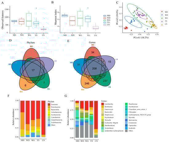 We assessed the gut microbial diversity of chickens from different regions (MD, WD, WG, YS, and LN) with insignificant differences in altitude. Alpha diversity analysis indicated that MD exhibited the highest gut microbial diversity, while LN exhibited the lowest (Figure 3A,B). PCoA plots based on Bray–Curtis distances revealed that WG and YS clustered together, suggesting a similar microflora composition between these two groups, while the other groups exhibited distinct separation and significant differences (Figure 3C). To compare the differences in gut microbial composition and abundance among the five groups, we constructed a Venn diagram at the phylum and genus levels, resulting in a total of 50 phyla and 1616 genera. As shown in Figure 3D,E, there were 17 shared phyla and 208 shared genera among the five groups. Moreover, WG and YS exhibited six and seven unique phyla, respectively, while the remaining groups had none. However, each group possessed its own unique genera, with WG and YS harboring the highest number and LN exhibiting the lowest. This indicates that WG and YS have a more diverse unique gut microbiota compared to the other three groups. Further analysis of the microbial composition at the phylum level revealed that Firmicutes, Proteobacteria, and Bacteroidota were the dominant microbiota across all five groups, with the relative abundance of Firmicutes in LN reaching 93.36% (Figure 3F). At the genus level, MD exhibited the highest relative abundance of Acinetobacter, followed by Comamonas, Escherichia-Shigella, and Myrides. Lactobacillus showed the highest relative abundance in WD, WG, YS, and LN, with LN exhibiting a remarkable abundance of 76.36%. Additionally, Sporosarcina emerged as the dominant bacterium in WD (Figure 3G).