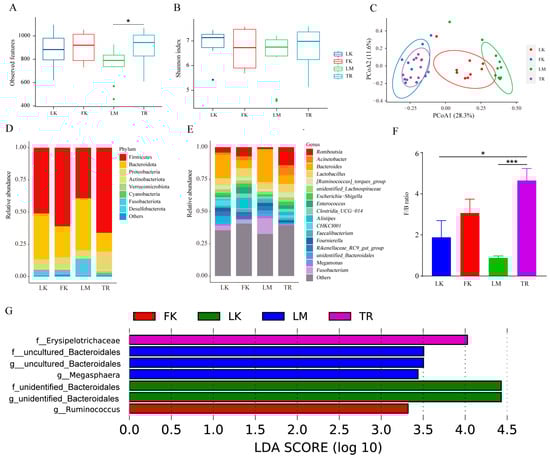 The gut microbiota of chickens residing in distinct geographical environments exhibits significant variation, and within the same feeding environment, the gut microbiota of broilers and laying hens varies according to breed. We compared the α diversity of each group using the observed features and Shannon index. While no significant difference was observed in the Shannon index among the four groups, the observed features index of LM was significantly lower than that of TR (p < 0.05) (Figure 4A,B). We employed Bray–Curtis distance-based PCoA plots to assess the differences in gut microbiota composition among the four groups. Figure 4C illustrates that the gut microbiota composition of LK, LM, and TR exhibited significant dissimilarities, while the microbiota of FK showed relative similarity to that of TR. At the phylum level, Firmicutes, Bacteroidota, and Proteobacteria predominated in both broilers and layers. Notably, the abundance of Fusobacteriota was higher in the three laying hen breeds compared to TR, with Fusobacteriota accounting for the highest proportion in LM (12.23%) (Figure 4D). At the genus level, Romboutsia accounted for the highest proportion in TR (14.09%), Alistipes was the most abundant strain in FK (8.15%), and Fusobacterium emerged as the dominant strain in LM (12.23%) (Figure 4E). Furthermore, comparing the ratio of Firmicutes to Bacteroidetes (F/B) revealed the highest ratio in TR (Figure 4F). LEfSe analysis identified seven differentially abundant microbiota (LDA > 2) among the four breeds, as depicted in Figure 4G.