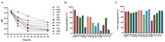 For the auto-aggregation assay [39], the isolated strains were grown overnight, and the OD600 values were adjusted to approximately 0.5 (A0) after two resuspension washes. A bacterial suspension of 4 mL was transferred to a new centrifuge tube and incubated at 37 °C for 24 h. The upper layer of liquid was then collected to determine the OD600 value (A24), and the experiment was repeated three times. The strain auto-aggregation ability was calculated using the formula: (A0 − A24)/A0 × 100%.