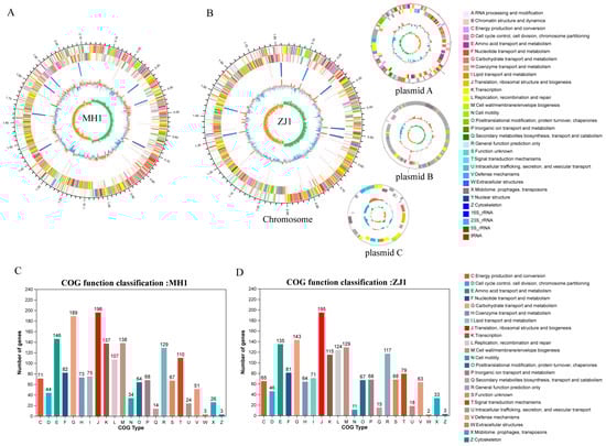 Genome features of Lactobacillus agilis MH1 and Lactobacillus salivarius ZJ1. (A) Circular genomic map of MH1 and (B) ZJ1. The two outermost circles are the CDS on the positive and negative chains, respectively, and the different colors indicate the functional classification of the different COGs of the CDS; the third circle is rRNA and tRNA; the fourth circle is GC content; The innermost circle is the GC skew value. (C) The COGs of the protein functional classification of the MH1 and (D) ZJ1.