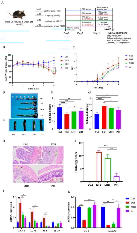Mouse experimental design: forty male C57BL/6J mice (6-week-old) were obtained from Chengdu Gempharmatech Co., Ltd., Chengdu, China. The mice were provided with free access to water and food and were maintained under 12 h light/dark cycles at a temperature of 23 °C. After a week of acclimatization, the mice were randomly divided into four groups (n = 10): control group (PBS gavage); DSS group (PBS gavage + 3%DSS water); MH1 group (MH1 gavage + 3%DSS water); and ZJ1 group (ZJ1 gavage + 3%DSS water). Over a period of 15 days, the control and DSS groups were gavaged with sterile PBS, while the MH1 and ZJ1 groups were gavaged with L. agilis MH1 and L. salivarius ZJ1 solutions, respectively. Each animal received 200 µL of the respective solution per day for the designated time period. From day 8 to day 14, all mice were provided with purified water ad libitum. From day 15 to day 22, the treatment groups (DSS group, MH1 group, and ZJ1 group) received water containing 3% dextran sulfate sodium (DSS) [42], with the DSS water being changed every two days (Table S2). The acute enteritis model of mice was established by feeding 3%DSS water for 7–8 days. On day 23, the mice were anesthetized and sacrificed, and the necessary samples were collected for testing.