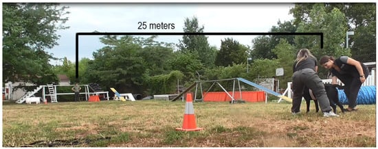 The recall test was performed by having the dog run between two recallers 25 m apart for a toy of their choice (a ball, a thin tug, or thick tug pillows). The recall test consisted of the dog being held by the collar by one person (