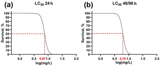 BPA concentrations below 6 mg/L did not result in significant fish deaths for the entire duration of the experiment. The obtained LC50 values at 24 and 48/96 h are shown in Figure 1, and the numerical data and conversion to mg/L are summarized in Table 1. The LC50 value at 48 and 96 h was 6.22 mg/L (CI 6.11–6.33).