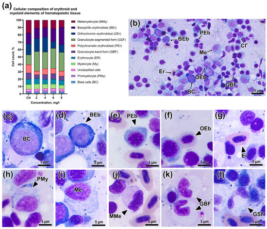 (a) Ratio of cellular elements of erythroid and myeloid lineages of hematopoietic tissue of Danio rerio head kidney: (b) microphotographs of individual stages of hematopoietic cells (b–l). BC—blast cell, BEb—basophilic erythroblast; PEb—polychromatic erythroblast; OEb—orthochromatic erythroblast; Er—erythrocyte; PMe—promyelocyte; Me—myelocyte; MMe—metamyelocyte; GBF—band form granulocyte; GSF—segmented form granulocyte. May–Grunwald–Giemsa staining. Scale bar: 15 μm (b) and 5 μm (c–l).