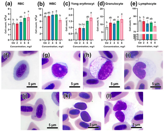 (a–e) Cell composition of peripheral blood of Danio rerio under acute exposure to Bisphenol A: (f,j)—young erythrocytes at different stages of differentiation; (g)—lymphocyte; (h,l)—granulocytes with different morphology of the nucleus; (i)—monocyte; (k)—thrombocyte. Significance (p < 0.05) from the Kruskal–Wallis test. Superscript letters (a, b) indicate statistical significance between different experimental groups. May–Grunwald–Giemsa staining. Scale bar of 5 μm.