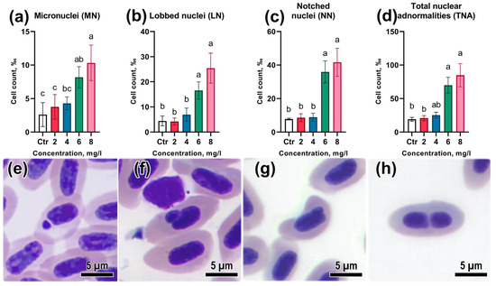 (a–d) Relative abundance of Danio rerio erythrocytes with nuclear abnormalities under acute exposure to Bisphenol A: (e) micronuclei; (f) blebbed nuclei; (g) lobed nuclei; (h) notched nuclei. Significance (p < 0.05) from the Kruskal–Wallis test. Superscript letters (a–c) indicate statistical significance between different experimental groups. May–Grunwald–Giemsa staining. Scale bar of 5 μm.