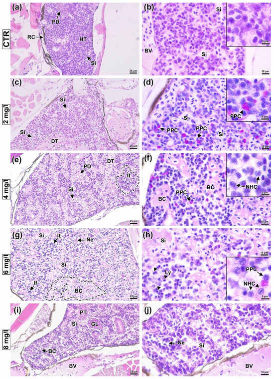 Histologic abnormalities in the hematopoietic tissue of Danio rerio head kidney exposed to BPA. CRT (a,b): normal structure of hematopoietic tissue (HT) surrounded by the renal capsule (RC) and including sinusoidal spaces (Si), blood vessels (BV), and areas of distal (DT), proximal tubules (PT), and glomeruli (GL). In the 2 mg/L group (c,d): sinusoidal spaces dilated, as well as an increase in the number of PAS-positive cells (PPC) in hematopoietic tissue, were observed. In the 4 mg/L group (e,f): enlarged sinusoids with evidence of blood congestion (BC), as well as small foci of inflammation (If, dashed line) in hematopoietic tissue, including necrotic cells (NHC). In the 6 mg/L group (g,h): significant sinusoidal enlargement with blood congestion (dashed line) throughout the head kidney; foci of inflammation and necrosis (Ne) associated with lymphocyte-like cells (Ly). In the 8 mg/L group (i,j): architectural and structural tissue alterations expressed as impaired circulation (sinusoidal dilation, blood congestion) and necrosis of hematopoietic tissue. H&E (a–c,e,i,j) and PAS (d,f–h) staining. Scale bar of 25 μm (a) and 10 μm (b–f).
