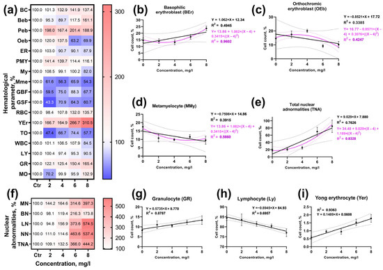 Concentration–effect relationship of BPA on hematological and hematopoietic parameters of Danio rerio. (a,f): matrix of changes in different parameters compared to the control in %; (b–e): comparison of linear and polynomial regression of hematopoietic parameters; (g–i): linear regression of hematological parameters.